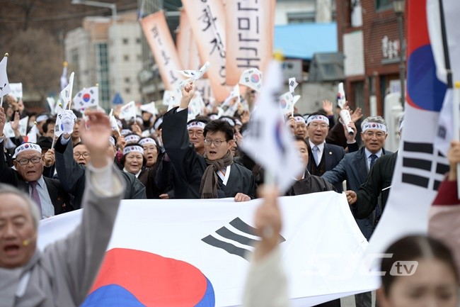 이번 행사는 관내 중고교 학생과 기관·단체 회원 등 1200여 명의 시민들이 참여해 공주 산성시장 문화공원에서 옛 충청감영터인 포정사 문루(공주사대부고 정문)까지 만세행렬을 이어갔다.