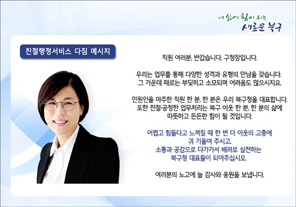 정명희 북구청장은 북구청 직원을 대상으로 “업무를 통해 민원인을 마주한 직원 한 분, 한 분이 모두 우리 북구청을 대표한다”며 “이웃의 고충에 귀 기울이고 소통과 공감으로 다가가서 배려로 실천하는 북구청 대표들이 되어주기를 바란다”고 친절행정서비스 다짐 메시지를 전달하였다.