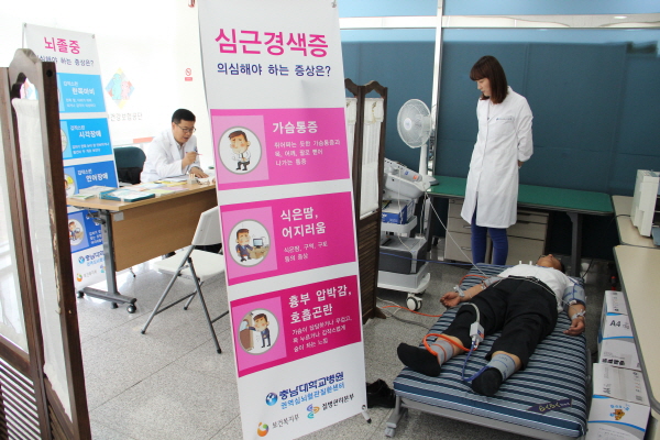 건강수준 점검은 고혈압?당뇨질환이 있는 직원 60여명을 대상으로 대전?충남 권역심뇌혈관질환센터 유원섭 교수진에 의해 동맥경화?혈관협착도, 스트레스 정도 등을 검사하고, 그 결과를 전문의가 분석?상담하였고, 이어서 건강강좌(심뇌혈관질환 예방 및 관리)를 실시하였다.