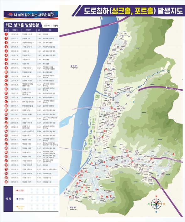이에 부산 북구는 안전한 도로관리를 위해 최근 3년간 관내 도로상에 발생한 싱크홀을 데이터베이스화하여 도로침하 발생한 싱크홀과 포트홀을 제작했다.