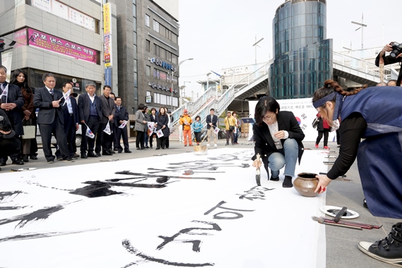이날 행사에서는 역사적 의의 해설 구포 만세운동, 독립선언문 각색 낭독, 100주년 기념 서예 피포먼스와 직원들의 시필 행사에 이어 정례조례 이후에는 주민에게 소형태극기를 배부하고 서예 손 글씨를 즉석에서 그려주는 시간을 가졌다.