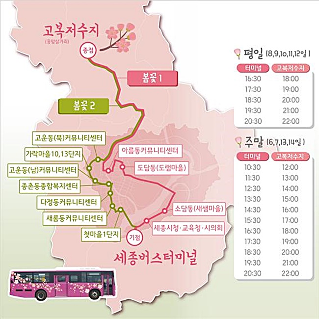 교통공사에 따르면 오는 6일부터 14까지 봄꽃 축제기간(4월 6일 ~ 7일까지)을 포함해 9일간에 걸쳐 세종고속버스터미널에서 고복저수지까지 운행하는 2개 노선 (봄꽃1번, 봄꽃2번)을 개설하고 운행할 계획이라고 말했다.