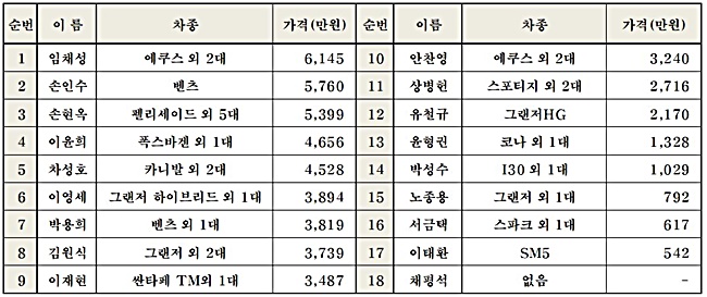8위가 김원식 의원이 그랜저 외 2대, 이재현 의원 싼타페TM 외 1대, 안찬영 의원이 에쿠스 외 2대, 상병헌 의원 스포티지 외 2대, 유철규 의원 그랜저HG 이다.