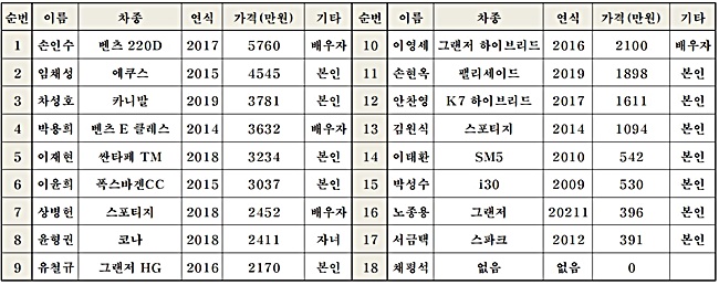 이어서 이윤희 의원이 폭스바겐 외 1대, 차성호 의원 카니발 외 2대, 이영세 의원 그랜저 하이브리드 외 1대, 박용희 의원 벤츠 외 1대이다.
