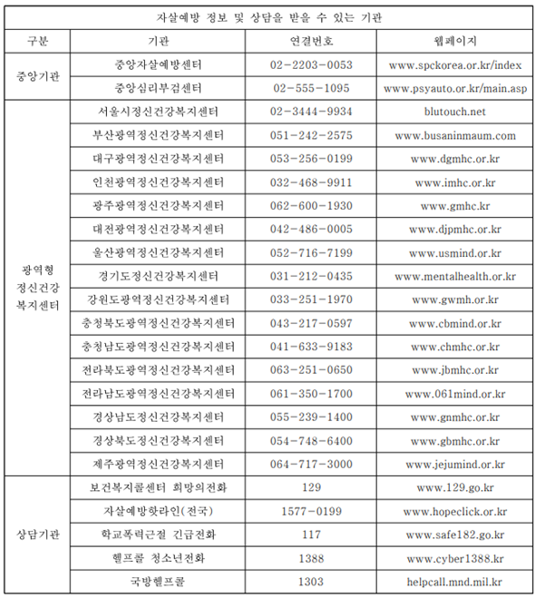 화 129, 생명의 전화 1588-9191, 청소년 전화 1388 등에 전화하면 24시간 상담을 받을 수 있다.