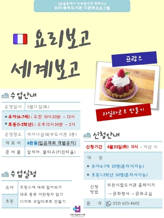 이번 특강은 유아와 어린이들을 대상으로 책과 음식을 통해 세계의 문화를 체험하고 다문화를 이해할 수 있는 기회를 제공하고자 마련됐다. 프랑스를 주제로 국기와 전통에 대해 알아보고 동화 ‘어린왕자’와 접목해 프랑스 대표 디저트 과일타르트를 만들어 볼 예정이다.