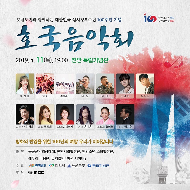 도는 오는 11일 오후 7시 천안 독립기념관 겨레의 집 앞에서 ‘충남도민과 함께하는 대한민국 임시정부 수립 100주년 기념 호국 음악회’를 개최한다고 밝혔다.