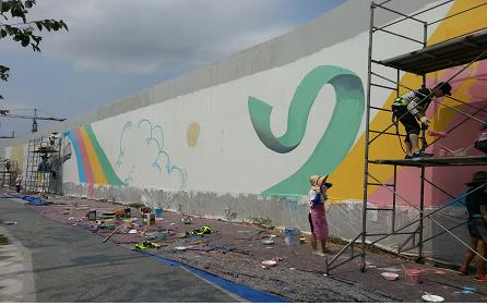 특히 지난 4일부터 일주일간 150여명의 학생들이 행복도시 내 유동인구가 많은 첫마을 BRT(간선급행버스체계) 버스정류장 인근 100m 구간에 높이 4m, 길이 50m의 초대형 벽화 2개를 그렸다.
