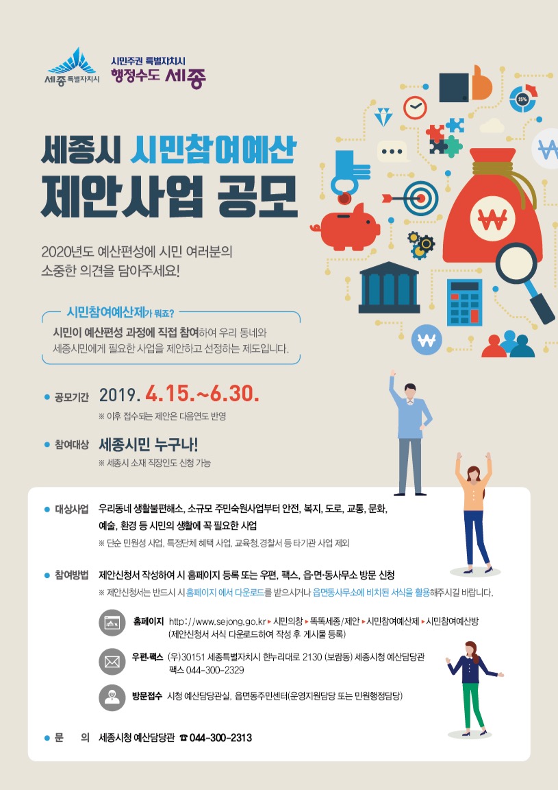 세종특별자치시(시장 이춘희)가 내년도 예산편성 과정에 시민참여를 통한 시민주권 특별자치시를 실현하기 위해 6월 말까지 ‘2020년 시민참여예산 제안사업 공모’를 실시한다.