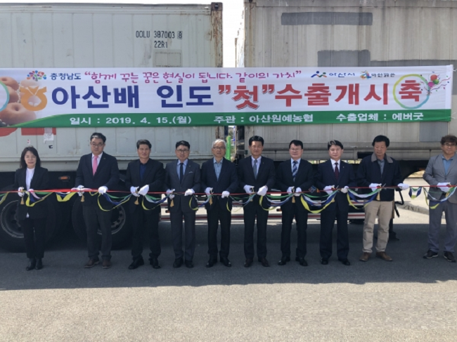 충남도는 15일 아산원예농협에서 농림축산검역본부, 농산물유통공사, 충남농협경제지주 관계자 등이 참석한 가운데 ‘충남 배 인도 첫 수출 선전식’을 개최했다.