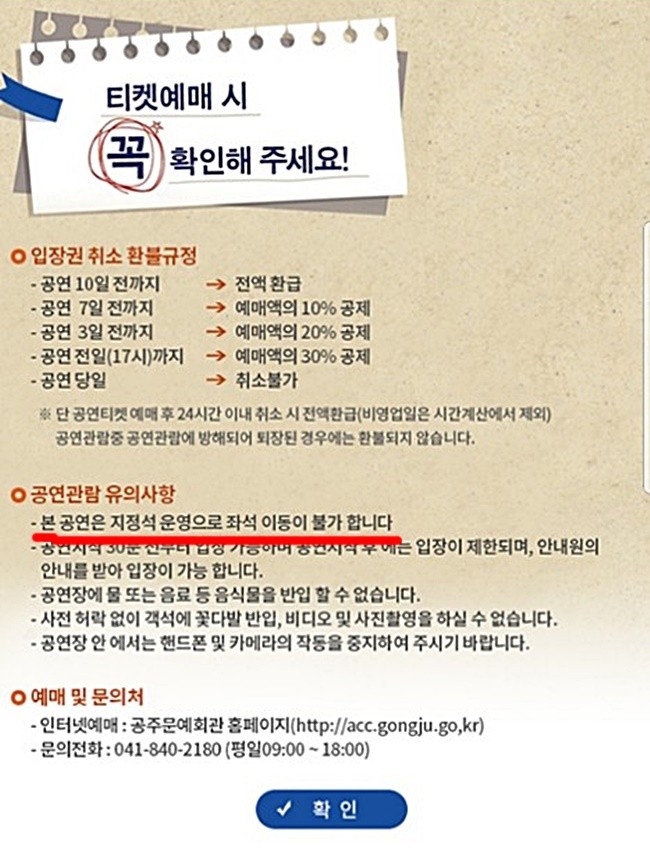 ▲ 공연관람 유의사항을 살펴보면 ‘본 공연은 지정석 운영으로 좌석 이동이 불가 합니다’란 문구로 혼돈 가능성도 제기된다.(사진=공주문예회관 홈페이지 캡처)