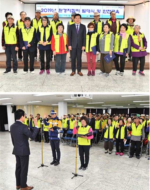 이는 노인 사회활동 지원사업의 목적으로 각 동에서 활동 중인 ‘실버 환경지킴이’와 ‘일회용품 줄이기 어르신 환경 패트롤’ 비롯해 재활용 선별작업 참여자, 환경 미화원 등 모두 200명을 ‘환경지킴이’로 위촉을 했다.