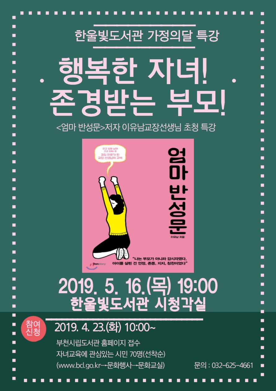 부천시 한울빛도서관은 가정의 달 5월을 맞아 5월 16일 자녀교육 분야 베스트셀러 《엄마 반성문》의 저자 이유남 교장을 초청해 부모교육 특강을 개최한다.