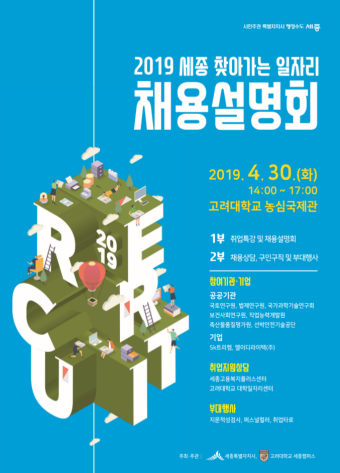 세종특별자치시(시장 이춘희)가 30일 고려대학교 세종캠퍼스 농심국제관에서 이전공공기관·기업 9곳이 지역 학생들에게 신규 채용계획을 설명하는 ‘세종 찾아가는 일자리 채용설명회’를 연다.
