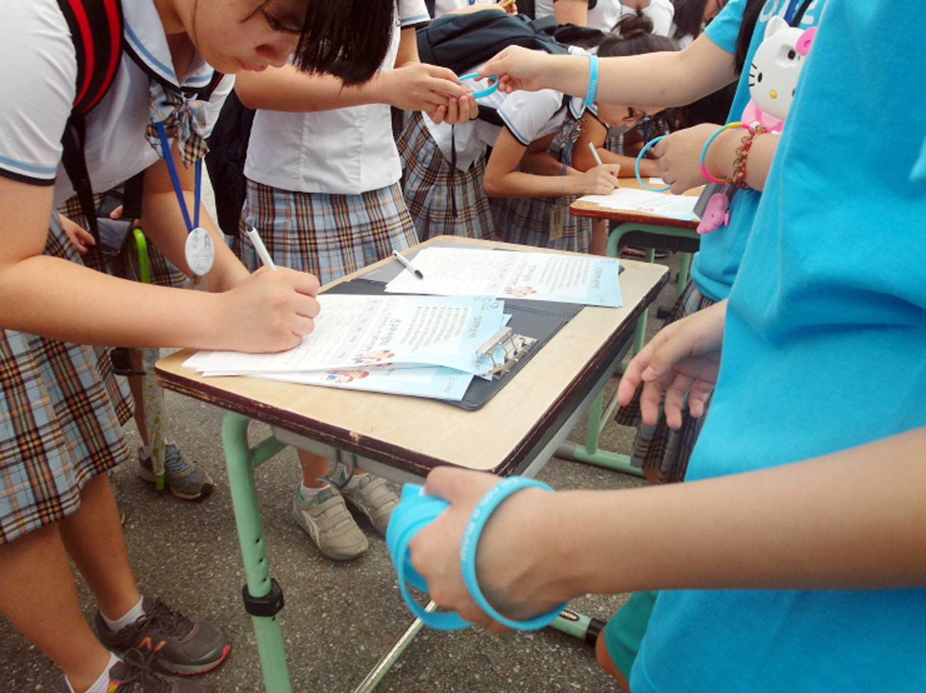 이날 블루밴드 연합동아리를 계획하고 지도하고 있는 이진남, 윤성자 교사와 56명의 동아리 소속 학생들은 ‘친구야, 사랑해!’라는 글씨가 새겨진 하늘색 티셔츠를 입고, 등교하는 학생들 한명 한명에게 학교폭력예방의 메시지를 담은 팔찌를 채워주며 학교폭력을 함께 추방하자는 메시지를 전했다.