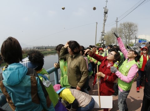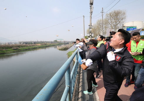 참석자들은 하천바닥에 퇴적된 오염물질 분해를 위해 유용미생물(EM) 발효액으로 만든 EM흙공 1천개를 굴포천에 투입하고 주변 쓰레기를 수거했다.