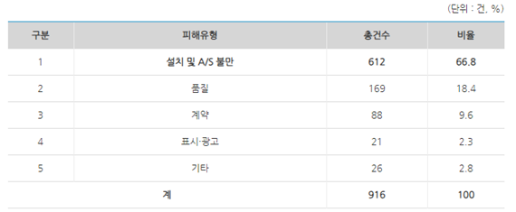 피해유형별로는 사업자의 설치상 과실, 설치비 과다 청구, 설치 지연·불이행, A/S 불만 등 ‘설치 및 A/S’ 관련이 612건(66.8%)으로 가장 많았고, ‘품질’ 관련 169건(18.4%) ‘계약’ 관련 88건(9.6%) 등의 순이었다.