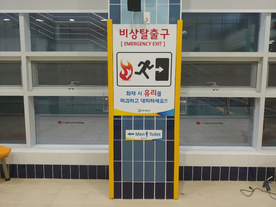 특히, 화재 시 연기로 인해 사람이 시선을 바닥에만 두는 점을 고려하여 복도 하단에 축광용 피난유도선을 설치하였다. 축광용 피난유도선은 별도의 전원 공급 없이 태양 또는 전등의 빛을 축적했다가 어두운 곳에서 빛을 발산하여 피난을 유도하는 기능을 한다.