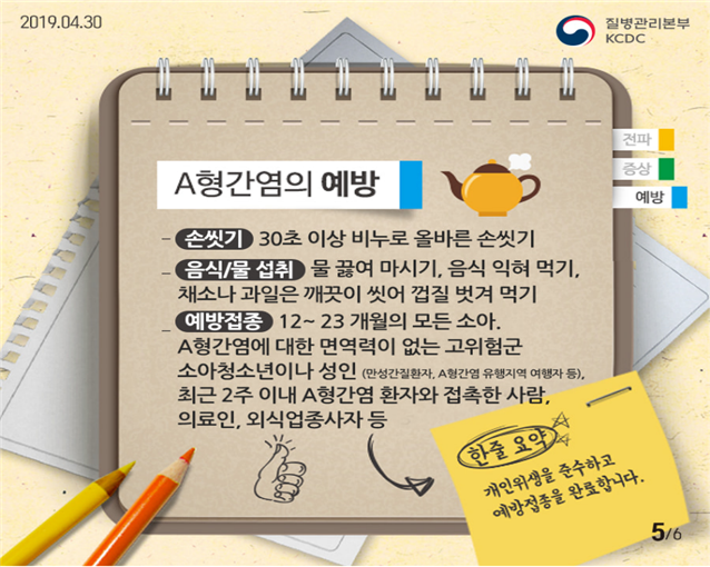 A형간염 예방을 위해서는 손 씻기, 음식 익혀먹기, 물 끌여 마시기 등 개인 위생을 철저하게 준수해야 한다.