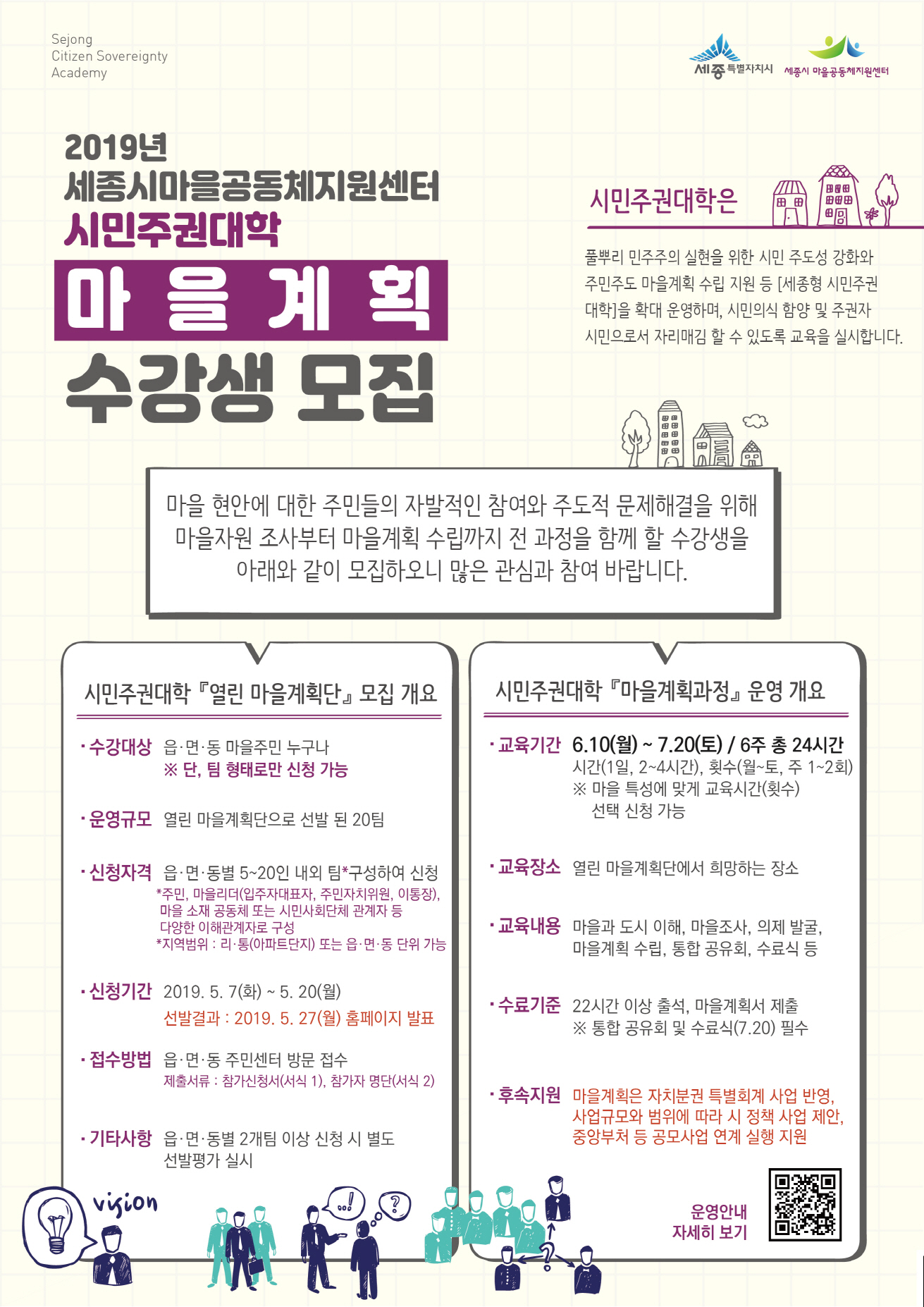 세종특별자치시(시장 이춘희)가 ‘시민주권특별자치시 세종’의 주요 추진사업의 일환으로, 마을자원 조사부터 마을계획 수립까지 전 과정을 함께할 시민주권대학 ‘마을계획과정’ 수강생을 모집한다.