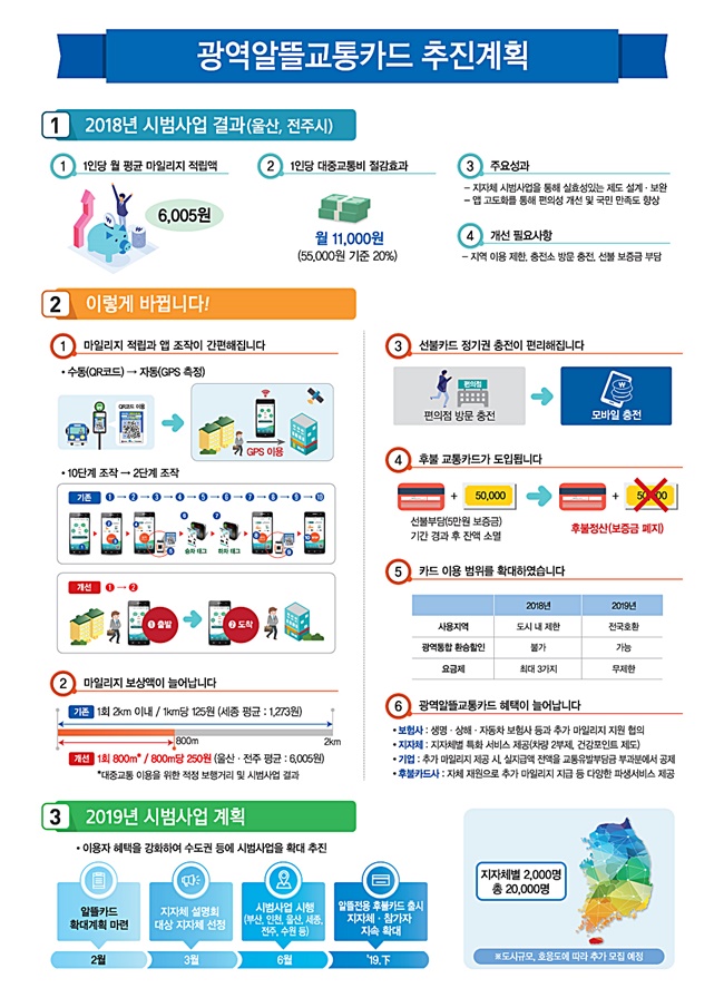 광역알뜰교통카드는 지난해 세종, 울산, 전주 등에서 시범사업을 거치며 문제점들을 대폭 개선, 전국 어디서나 사용이 가능해졌으며 후불교통카드와 자동적립 기능이 도입됐다.