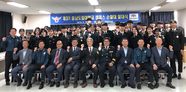 충남도립대학교는 10일 청양경찰서 대회의실에서 허재영 총장과 이관형 서장, 경찰행정학과 학생 39명 등이 참석한 가운데 ‘제3기 충남도립대학교 캠퍼스 순찰대 발대식’을 개최했다고 밝혔다.