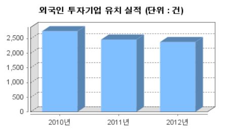 24일 산업통산자원부에 따르면 2010년부터 2012년까지 3년간 우리나라에 투자한 FDI는 총 7600개 기업으로, 2010년 2753개 기업, 2011년 2465개 기업, 2012년 2382개 기업 등 매년 평균 2533개 업체가 투자를 결정했다.