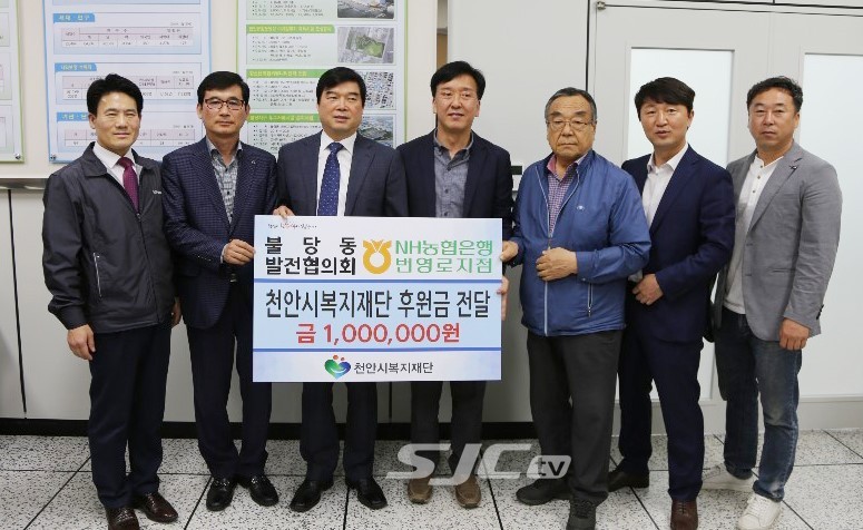천안시 불당동(동장 이명열)은 불당발전협의회와 농협은행 번영로지점(지점장 배덕재)이 14일 관내 어려운 이웃을 위해 사용해 달라며 사랑의 성금 100만원을 천안시 복지재단에 전달했다고 밝혔다.
