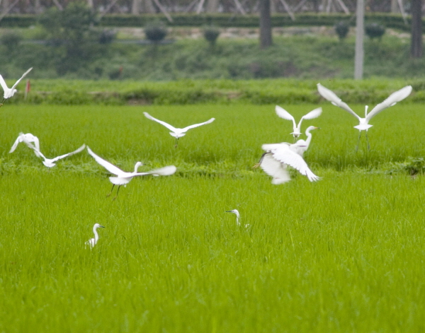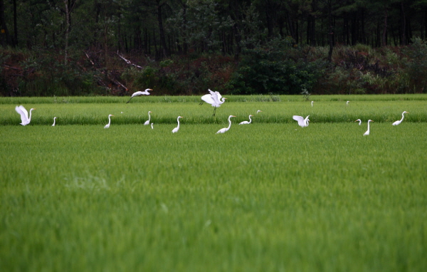 왜가리, 백로가 있는 농경지의 대부분은 친환경농업단지로 이곳엔 우렁이, 미꾸라지, 새우 등 수생생물과 곤충이 많다.