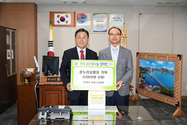 예산군은 ㈜인지디스플레이가 지난 15일 예산군청 군수실을 방문해 온누리상품권 1만원권 2000장을 기탁했다고 밝혔다.