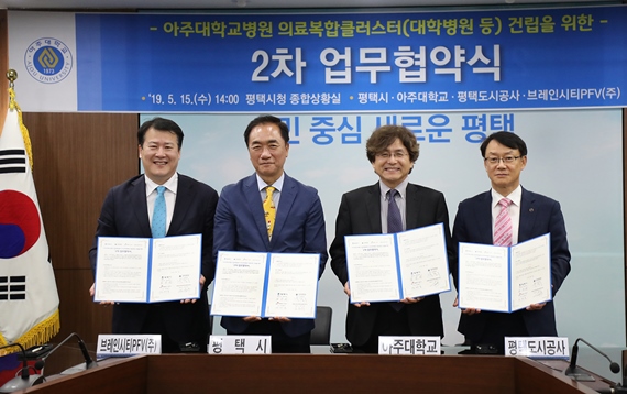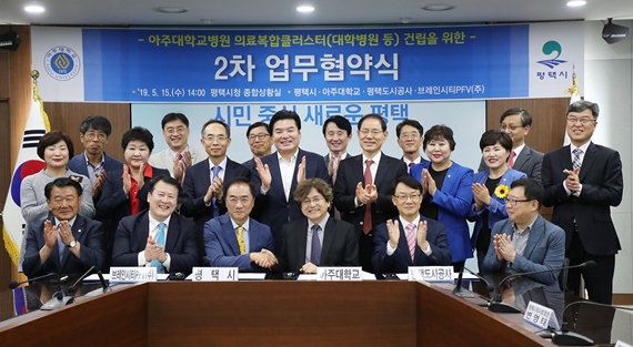 평택시가 지난 15일 시청 종합상황실에서 정장선 시장, 평택시의회 권영화 의장, 원유철 국회의원, 시의원 및 지역 의료기관단체장 등이 함께 참여한 가운데 평택시공사, 아주대학교, 브레인시티PFV(주)가 평택 브레인시티에 아주대병원을 포함한 의료복합클러스터 건립을 위한 2차 업무협약을 맺었다.