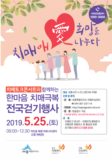 세종특별자치시보건소(소장 권근용)가 치매 예방에 좋은 걷기를 실천하기 위해 오는 25일 어진동 복합커뮤니티센터에서 치매 토크 콘서트와 함께하는 한마음 치매극복 걷기행사를 연다.