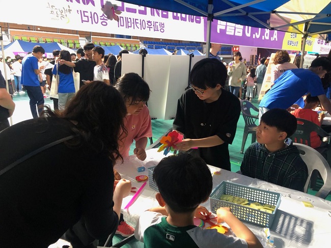 예산군청소년수련관 송아리방과후아카데미가 지난 18일 예산윤봉길체육관에서 진행된 제5회 예산군 청소년축제 『꽃 피우다』에서 송아리방과후아카데미 홍보 및 무지개 바람개비 만들기 체험부스를 운영했다.