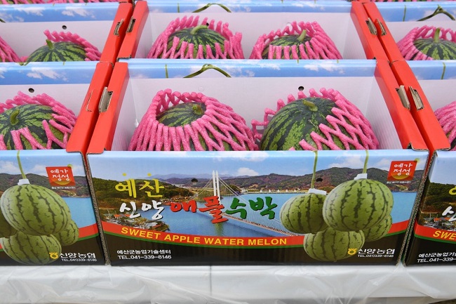 예산군농업기술센터는 21일 황선봉 군수를 비롯한 애플수박 재배농가 20여명이 참석한 가운데 신양면 서계양두련길 정송희 씨(72세) 농가를 방문해 첫 출하를 축하했다고 밝혔다.