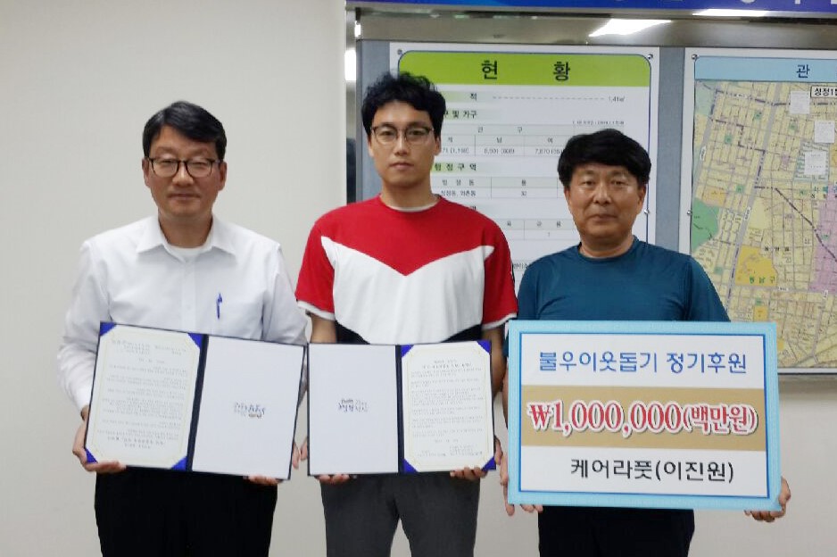 천안시 성정1동(동장 김웅)은 인터넷 평판관리 전문업체인 ‘케어라풋(대표 이진원)’이 지난 23일 관내 취약계층을 위해 매월 100만원의 성금을 정기기탁하기로 하고 협약식을 가졌다고 밝혔다.