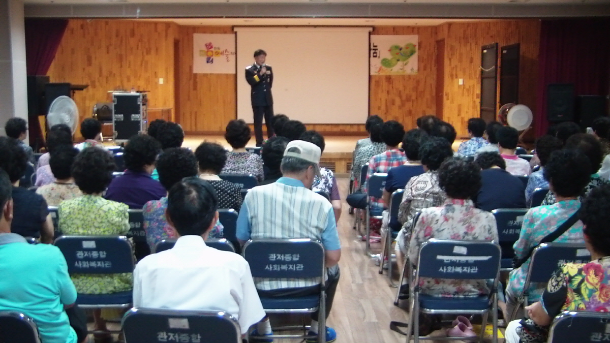 대전서부경찰서(서장 이병환)는 26일 오전 10시 서구 관저동 관저사회복지관을 찾아 경찰서장이 직접 노인대학 어르신 100명을 상대로 어르신 눈높이에 맞는 교통홍보 교육과 자체 제작한 야광형광 조끼 등을 전달했다.
