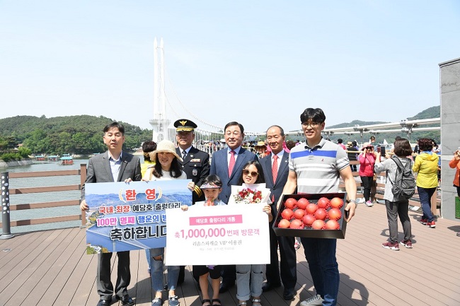 군는 이날 100만번째 관람객인 김민기(41세, 아산시) 씨 가족에게 축하 꽃다발과 예산사과세트, 4인가족 스파vip이용권을 전달하고 축하했다.
