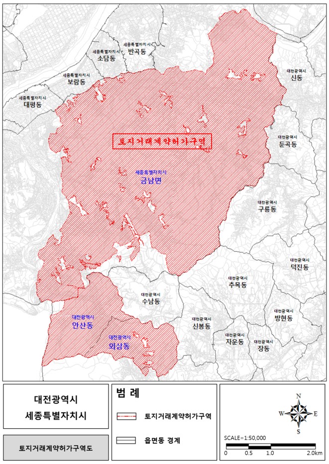 시는 국토교통부가 세종·대전 광역권 허가구역 지정기간이 30일로 만료됨에 따라 기존 세종시 금남면 일원(38.32㎢)과 대전시 유성구 일원(7.12㎢)을 토지거래계약 허가구역으로 재지정·공고했다고 밝혔다.