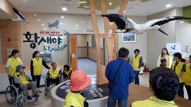 28일 황새공원에서는 뇌병변 환자와 가족들의 마음 힐링을 위해 천연기념물 제199호인 황새의 복원과정을 영상으로 시청하고 자연생태체험장을 관람했으며 노래자랑 레크리에이션도 진행됐다.