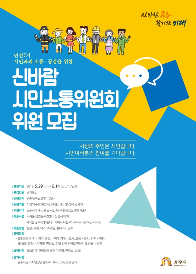 공주시가 오는 7월 출범을 앞둔 신바람시민소통위원회 위원 100명을 공개 모집한다.