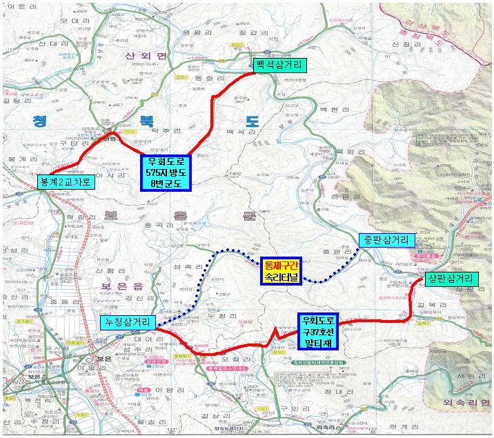 공사 당일 이 지역을 통행하는 차량은 구(舊) 국도인 누청삼거리~말티고개~상판삼거리 구간(10.7㎞)으로 우회하여 통행하면 된다. 또 지방도 575호선을 이용하여도 속리터널 우회통행이 가능하다.