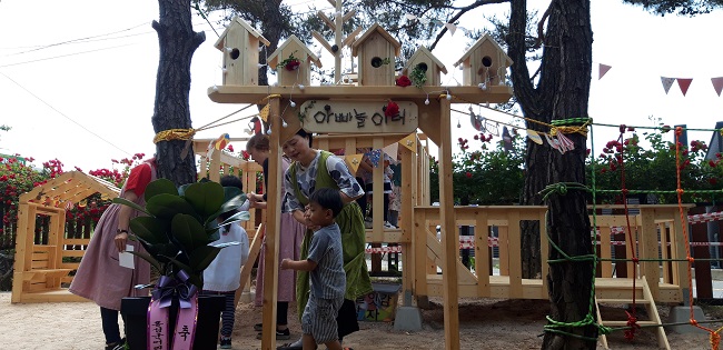 군에 따르면 국공립 코오롱 어린이집에 다니는 아이의 아빠들이 주말에 모여 함께 고민하며 아이들의 놀이터인“아빠놀이터”를 조성했다는 것