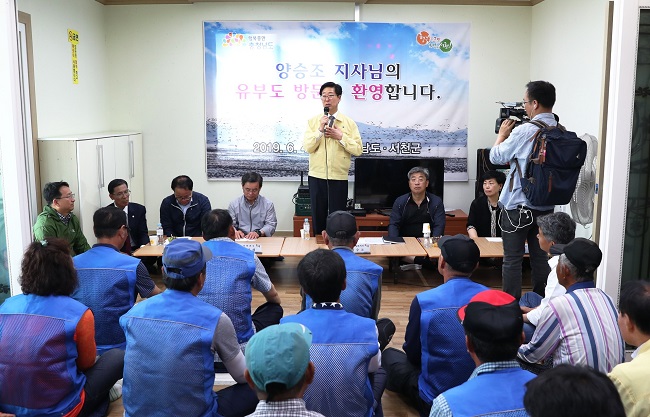 양 지사는 이날 노박래 서천군수 등 관계자가 참여한 가운데 유부도를 찾아 주민과의 대화의 시간을 갖고 유부도 갯벌 해양생태계 복원사업 현황을 살폈다.