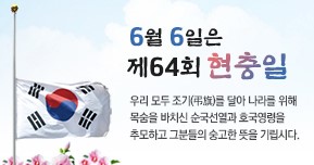 현충일은 나라를 위해 목숨을 바치신 순국선열과 호국영령에 대한 추모 및 숭고한 뜻을 기리고자 지정된 공휴일로, 이날은 태극기를 조기를 게양한다.