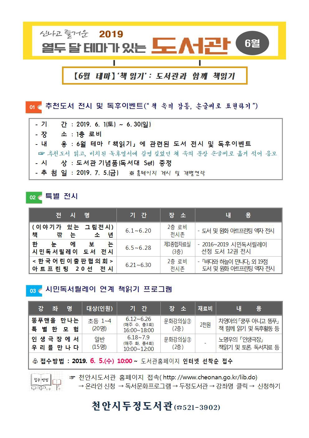 두정도서관 관계자는 “6월 테마 행사를 통해, 2019 시민독서릴레이 책을 시민들이 함께 읽고 공감대를 형성하고, 다채로운 책읽기 프로그램을 통한 독서의 중요성과 즐거움으로 책 읽는 분위기 조성하여 독서문화확산에 앞장서겠다”고 말했다.