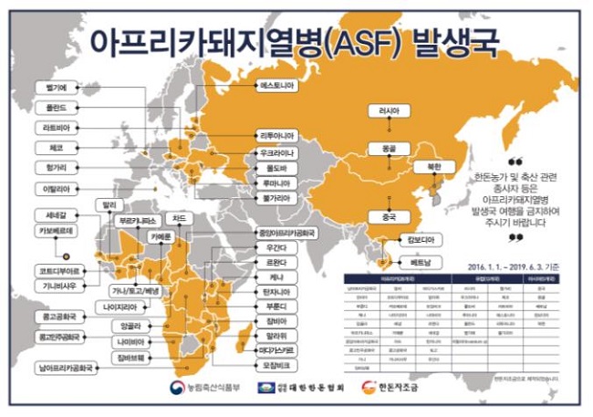 현재 질병발병 현황은 매우 위급단계로 작년 8월 중국 아프리카돼지열병 (African Swine Fever, 이하 ASF)의 발병에 이어 올해 몽골(1월), 베트남(2월), 캄보디아(4월)에 발생하였고 최근 중국 접경지인 북한 자강도에 ASF가 확인된 바 있다.