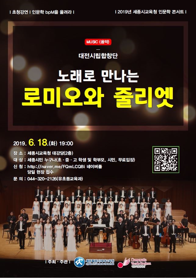 이번 인문학 콘서트의 세 번째 강연은 ‘음악으로 만나는 로미오와 줄리엣’이라는 주제로 6월 18일(화) 오후 7시, 세종시교육청 대강당에서 대전시립합창단를 초청하여 셰익스피어의 비극적 낭만 ‘로미오와 줄리엣’을 노래로 만나는 시간을 갖는다.