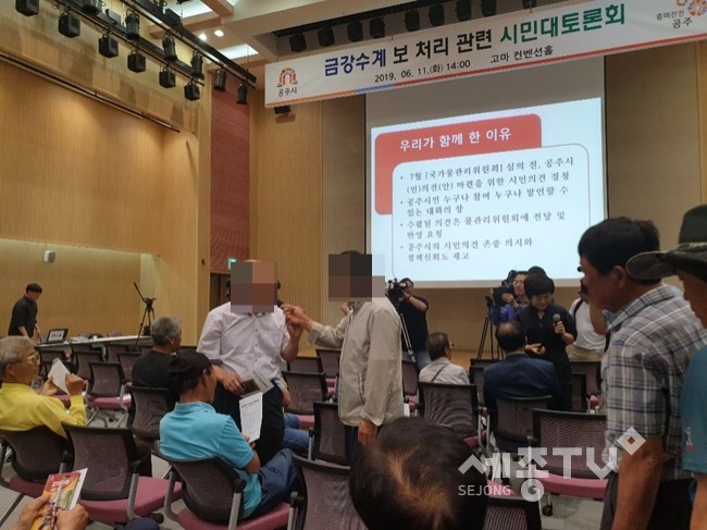 공주시가 ‘금강수계보처리 관련 시민토론회’를 11일 오후 2시 고마센터에서 열릴 예정이었으나 시작 전부터 이창선 공주시의회 부의장이 무대에 올라 "이런 토론회는 들을 필요도 없다"며 시민들의 퇴장을 동요해 찬-반 시민들의 싸움으로 번지며 토론회장이 아수라장이 됐다.