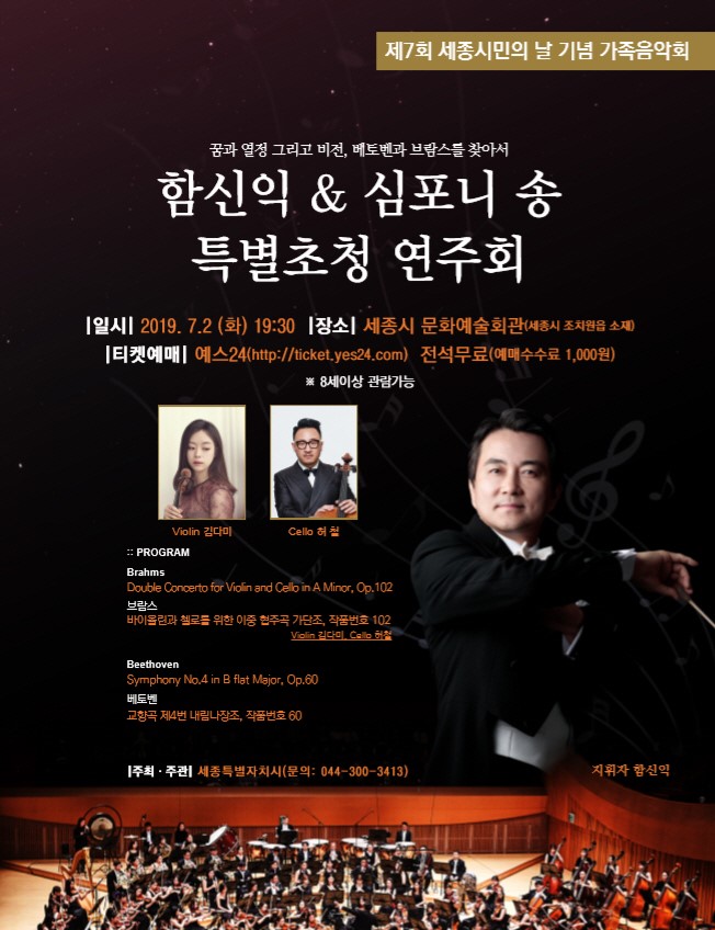 이번 공연은 지휘자 함신익과 70여 명의 심포니송 오케스트라가 브람스와 베토벤의 명곡을 주제로 세종시민에게 수준 높고 풍성한 교향악을 선보일 예정이다.