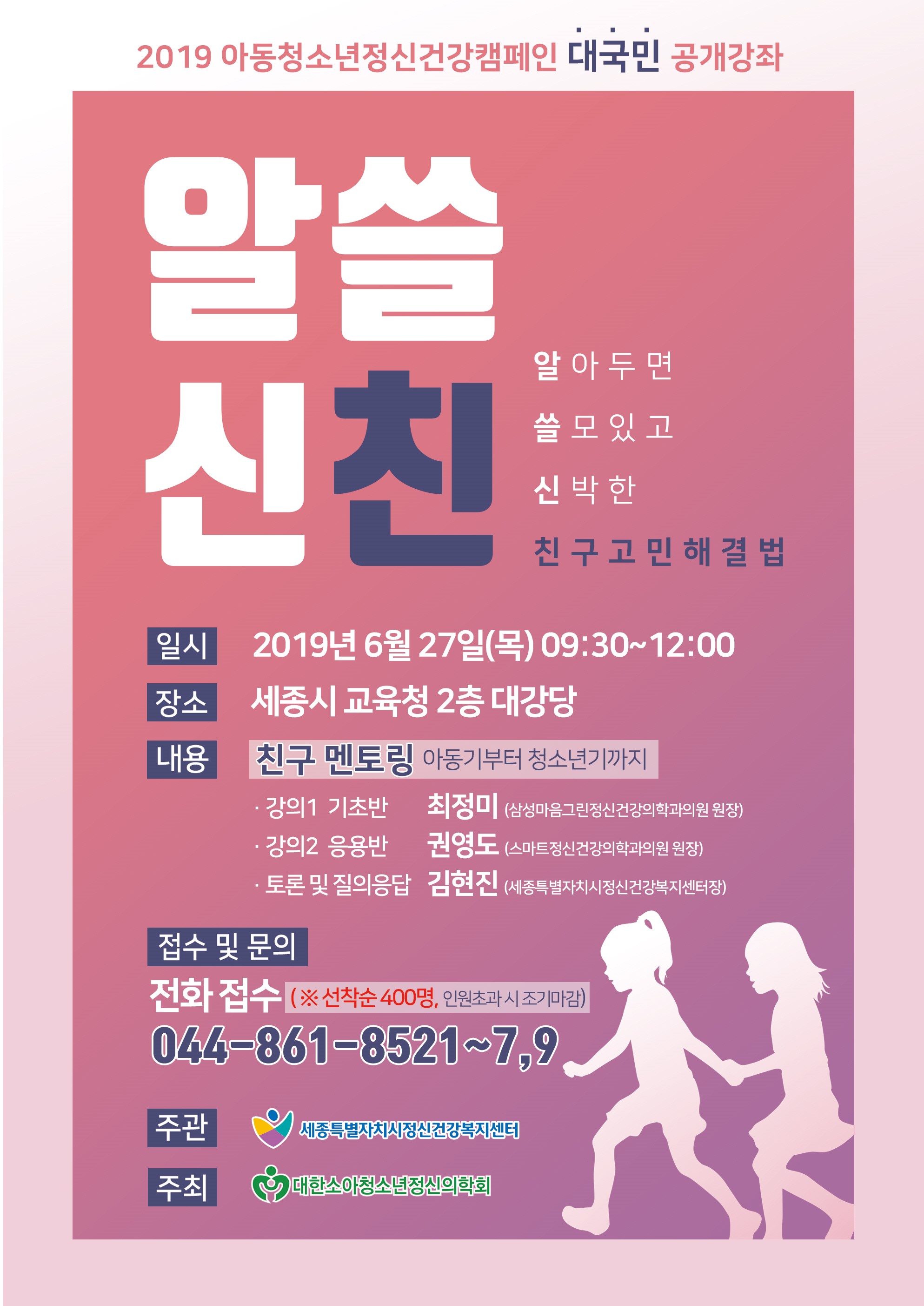 세종특별자치시 정신건강복지센터가 오는 27일 오전 9시 30분부터 12시까지 세종시교육청 2층 대강당에서 ‘알고 보면 쓸모 있는 신박한 친구고민해결법(알·쓸·신·친)’을 주제로 대국민 공개강좌를 연다.